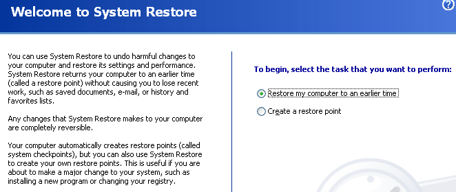 - Start System Restore: (you can find it here: Start / All Programs / Accessories / System Tools / System Restore)