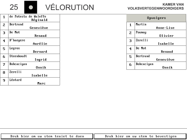 The ubiquitousness of mobile phones equiped with a camera gives coercers a new opportunity to require proof from the persons they are coercing. The coercer just has to instruct his victim to take a picture of his ballot. The Belgian electronic ballot is designed to prevent this. When you’ve casted your vote, you’ll see a screen like this one:
