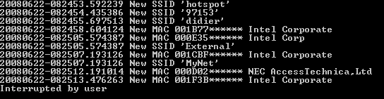 If you don’t want to see new MAC addresses displayed in the console, provide option –nonewclients. Likewise, use option –nonewssids to keep quiet about new SSIDs.