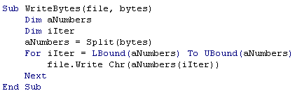 Each DumpFileX sub writes bytes to the temporary file (the DLL is embedded in these subs by including the hex dump in strings). It’s necessary to split this over several subs, because of the sub size limitation.