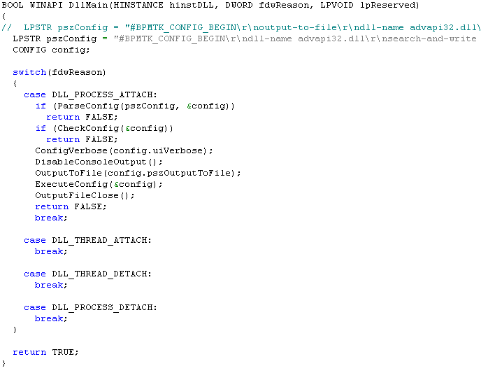 So now you can also load the bpmtk as a DLL in a process and it will execute its configuration. The configuration is embedded in the DLL as an ASCII string. To change the configuration, you’ve 2 options: