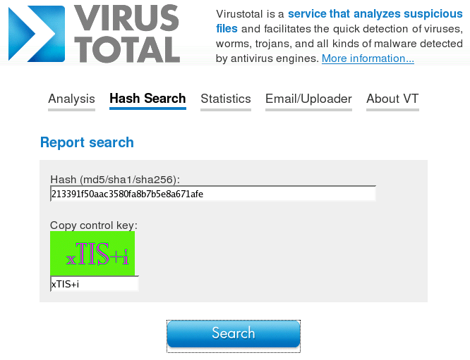 Let me draw your attention to VirusTotal’s Hash Search function: