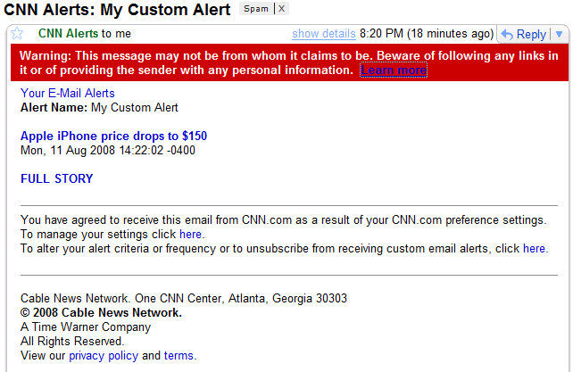 Gmail identified the Fake CNN Alerts as SPAM from the beginning, but now warns against phishing too: