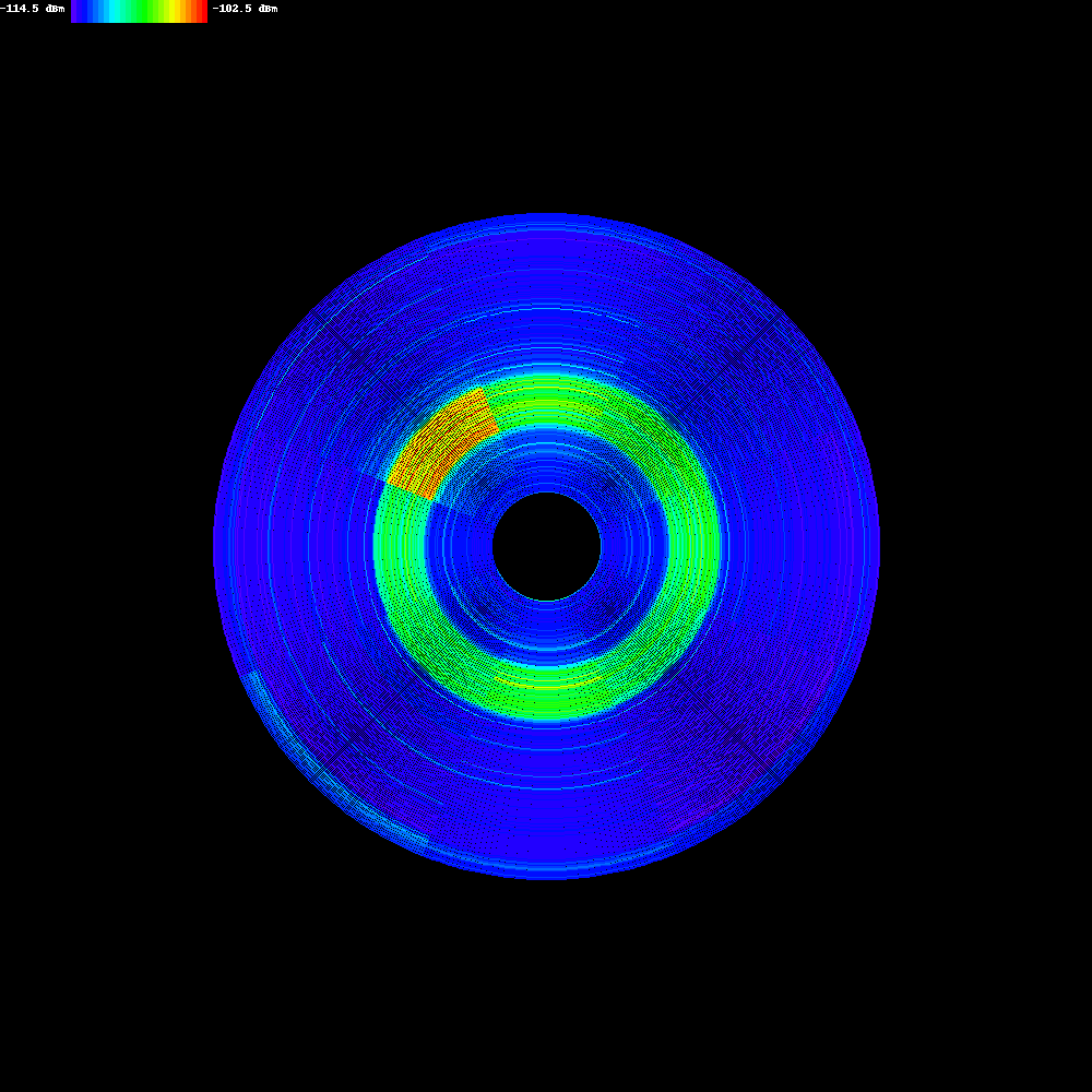The following radial plot shows the average amplitude for each sampled frequency. The frequency is set out on the radial axis (the lowest frequency is closest to the center, the highest is the most distant), the angular coordinate is just the orientation of the directional antenna. Amplitude is hue color-coded.