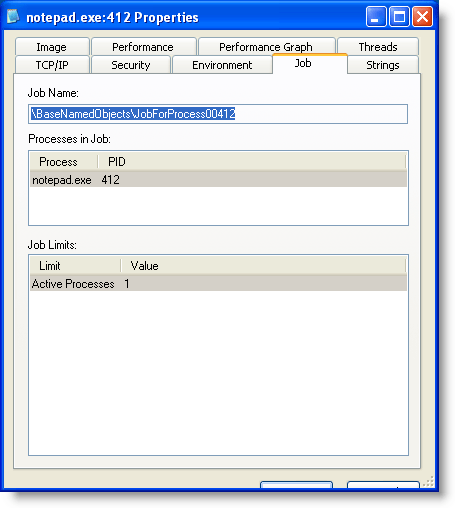 If you try this with my tool, you won’t see the process highlighted brown or the Jobs tab in Process Explorer. Process Explorer does not display the job info when the handle to the job has been closed (the screenshots above are with a modified version of my tool that doesn’t exit and leaves the job handle open). I don’t know yet if this is a bug or a feature in Process Explorer. I need to find out.