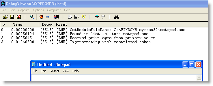 When this DLL is loaded inside an existing process, it will check a whitelist and a blacklist to decide if it has to restrict the process’ rights (it also checks if it’s running on Windows XP). If the application’s name if found in the blacklist and not in the whitelist, LowerMyRights will do its job.