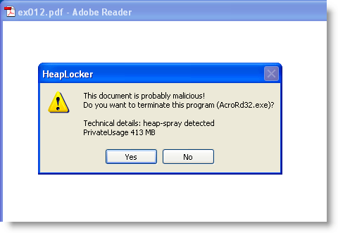 When HeapLocker is loaded inside Acrobat Reader (AcroRd32.exe process), it will find the PrivateUsageMax setting and start a new thread inside the Adobe Reader process. During most of its life, this thread will do nothing (sleep). Every second, it will wake-up and check the amount of private memory allocated by the process (PrivateUsage). If this amount is equal to or larger than the maximum value specified in PrivateUsageMax, the thread will suspend all other threads in the process and display a message box to the user.