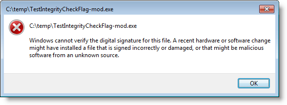 If you want to test this, you can download a dummy application I signed here (32-bit). When you change the executable (TestIntegrityCheckFlag.exe), Windows will refuse to run it.