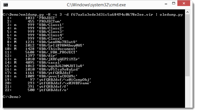 Now emldump is able to analyze the multipart MIME file, and detect the MSO file (part 3). oledump can analyze MSO files:
