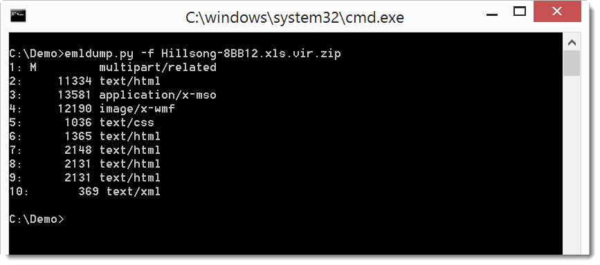 Lines 2, 3, 6, 7 and 8 are there to obfuscate this MIME type file. emldump.py now detects all lines without a colon in the first block (all lines before the empty line 9: 1 – 8).