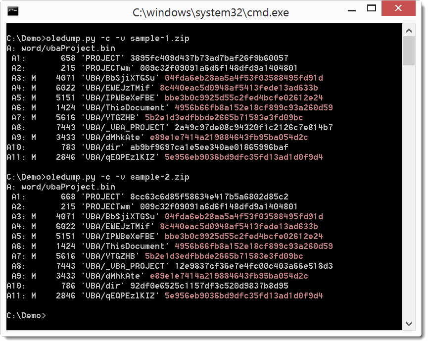 Here I can see that the hashes of the macro streams are identical, hence that although I have 2 different samples, the VBA code is identical.