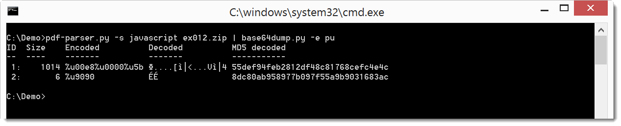 Here’s an example with escaped unicode in JavaScript (%u), namely a PDF with shellcode in JavaScript: