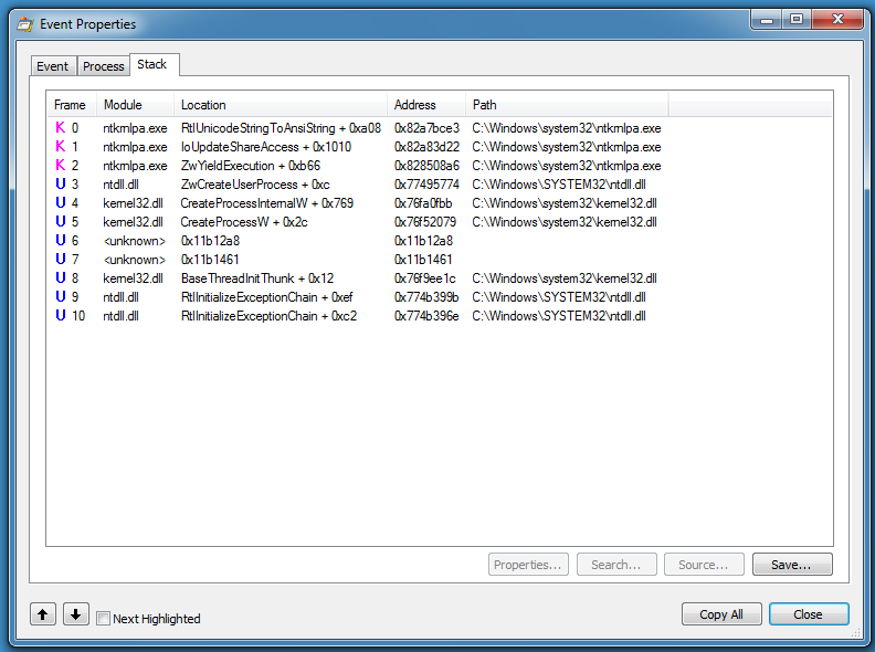 If we look in the call stack of the process creation of notepad.exe, we see 2 frames (6 and 7) with unknown modules: