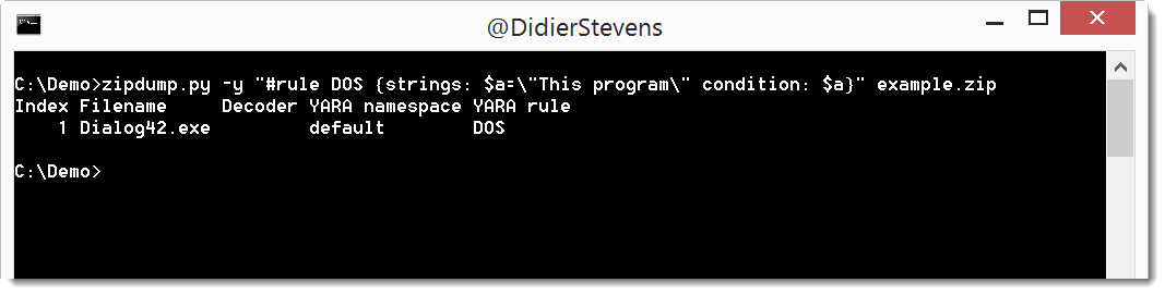 In this new version of zipdump.py, you can provide a YARA rule directly on the command line, without having to store it inside a file.