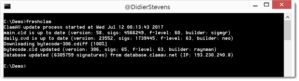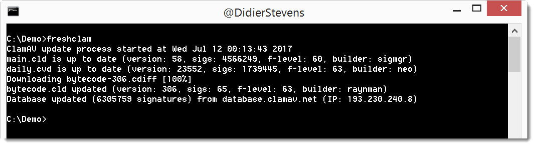First I update the signatures (yup, that’s ClamAV on Windows):