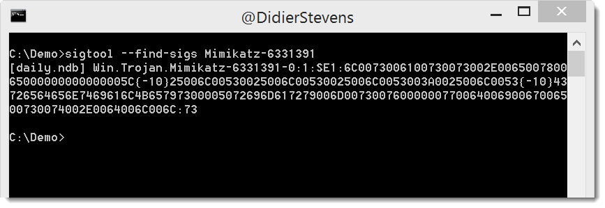 Then I do a search with sigtool in the database, providing a regular expression (Mimikatz-6331391) to match signature names (this matching process is case sensitive):