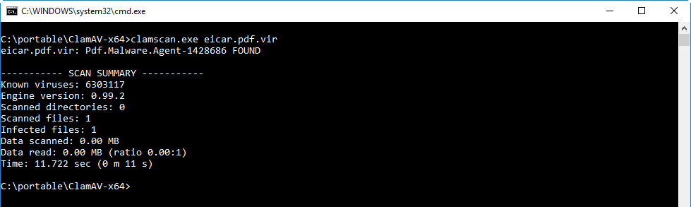 And now I can run clamscan.exe to scan a sample: