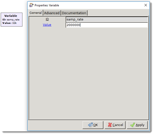For my RTL-SDR, I will use 2 MHz (2000000 Hz). Double click the Variable block, change the value and click OK: