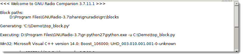 GNU Radio Companion creates the top_block.py program (the name comes from the ID in the Options block), and executes it with GNU Radio: