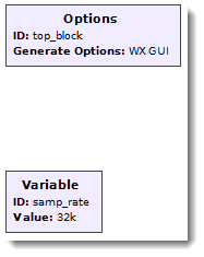 Variable is a block that defines a variable for the sample rate: samp_rate. By default, it’s 32k (32000), but that’s too small.