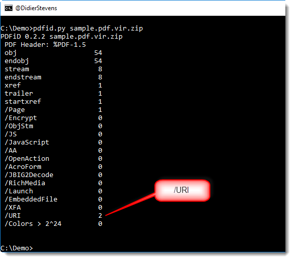 This new version of pdfid.py adds a /URI counter, to help identify PDF documents with embedded URLs, used for phishing or social-engineering users into clicking on links.