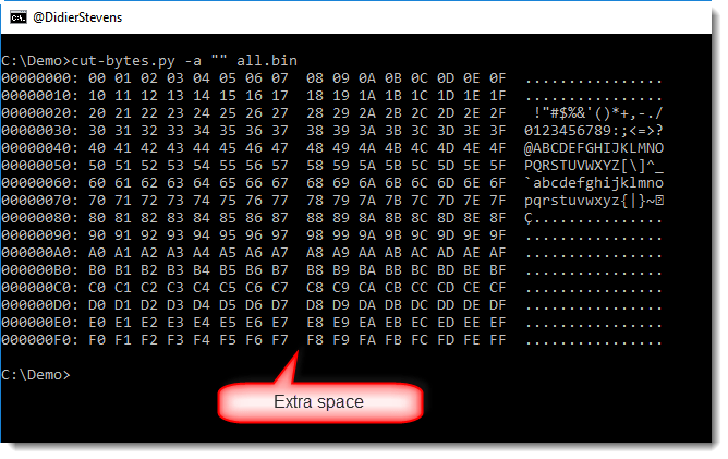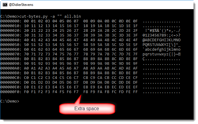 This new version of cut-bytes.py brings a small cosmetic change to the way a hex/ASCII dump is displayed: