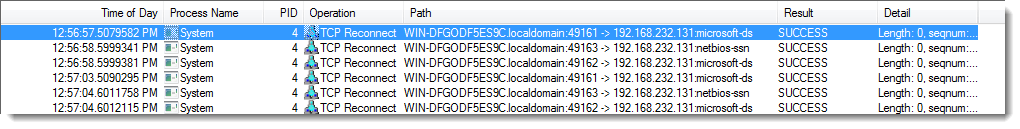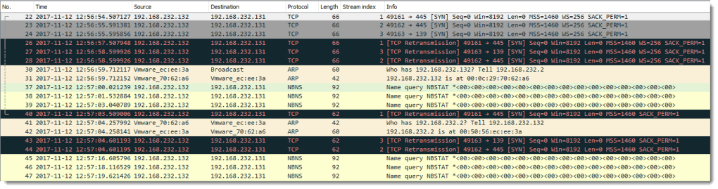 First we see attempts to connect on ports 445 and 139 on the IIS machine (SYN packets):