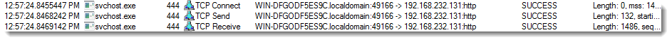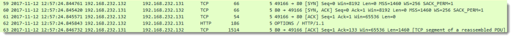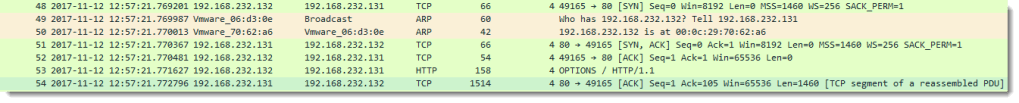 There are no packets coming back from the IIS machine (I blocked port 139 and 445), and after almost 30 seconds we see an HTTP request to port 80 on the IIS machine: