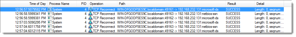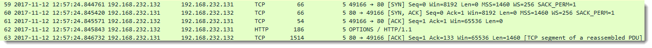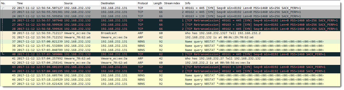 First we see attempts to connect on ports 445 and 139 on the IIS machine (SYN packets):