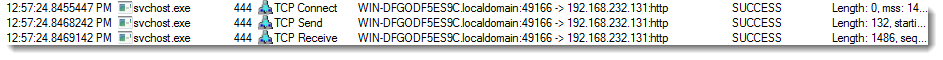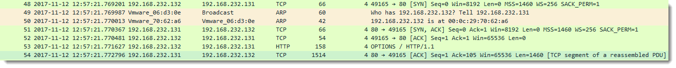 There are no packets coming back from the IIS machine (I blocked port 139 and 445), and after almost 30 seconds we see an HTTP request to port 80 on the IIS machine: