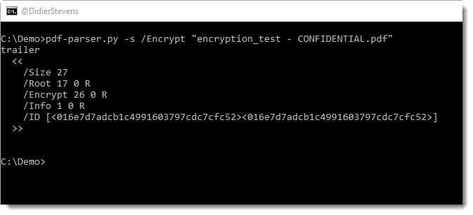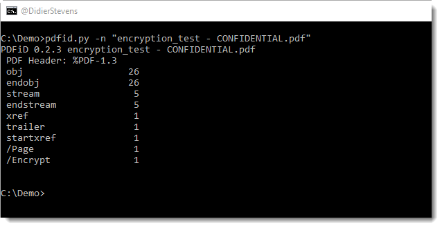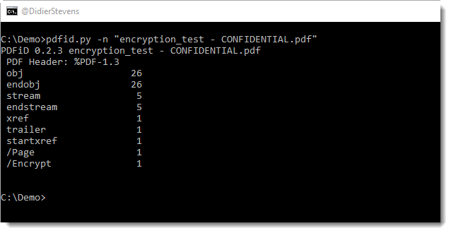 pdfid.py confirms the PDF is encrypted (name /Encrypt):