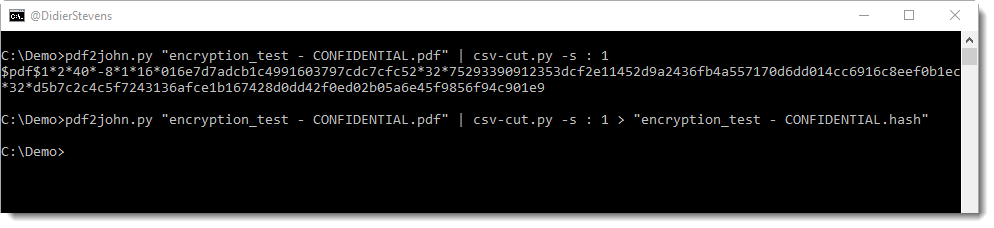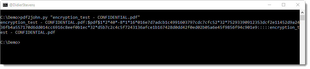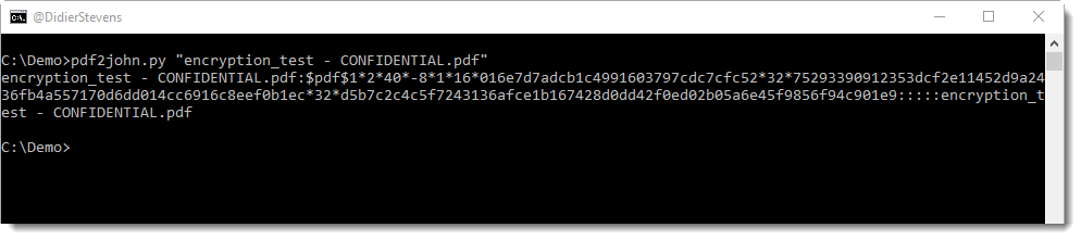 First we need to extract the hash to crack from the PDF. I’m using pdf2john.py to do this. Remark that John the Ripper (Jumbo version) is now using pdf2john.pl (a Perl program), because there were some issues with the Python program (pdf2john.py). For example, it would not properly generate a hash for 40-bit keys when the /Length name was not specified (like is the case here). However, I use a patched version of pdf2john.py that properly handles default 40-bit keys.