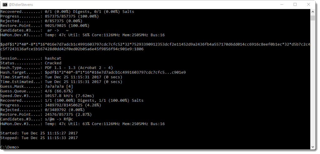 hashcat-4.0.0\hashcat64.exe --potfile-path=encryption_test.pot -m 10400 -a 3 -i "encryption_test - CONFIDENTIAL.hash" ?a?a?a?a?a?a