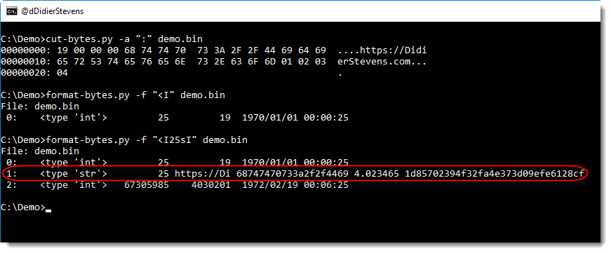 This new version of format-bytes.py display extra information when unpacking strings: string length, first 10 bytes of the string (ASCII and HEX), entropy and MD5 hash.