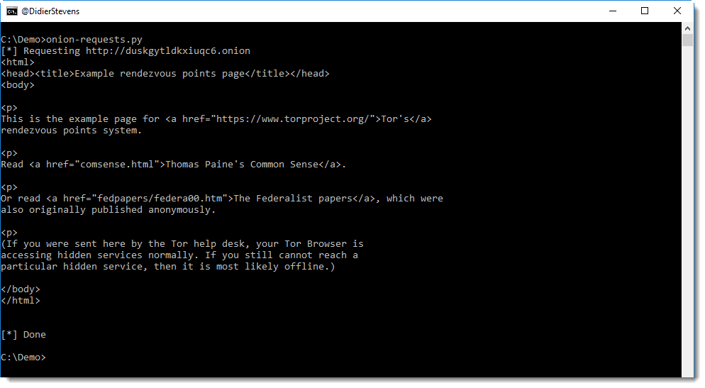 I wanted a program to connect to Tor Onion Services (aka hidden services). It’s written in Python and uses the PySocks module: