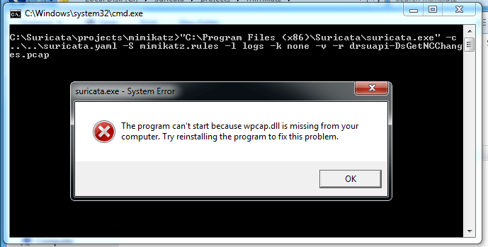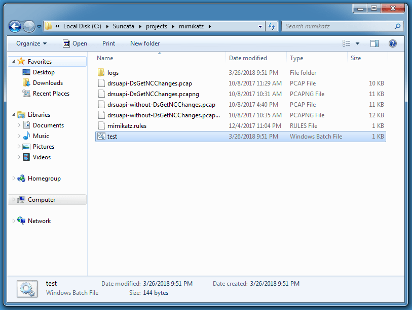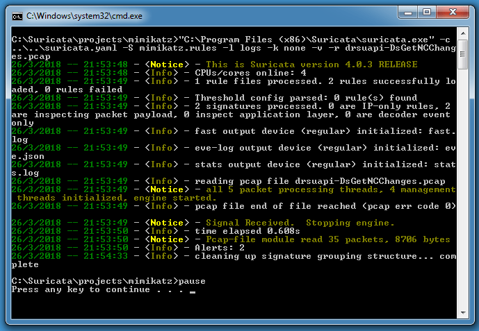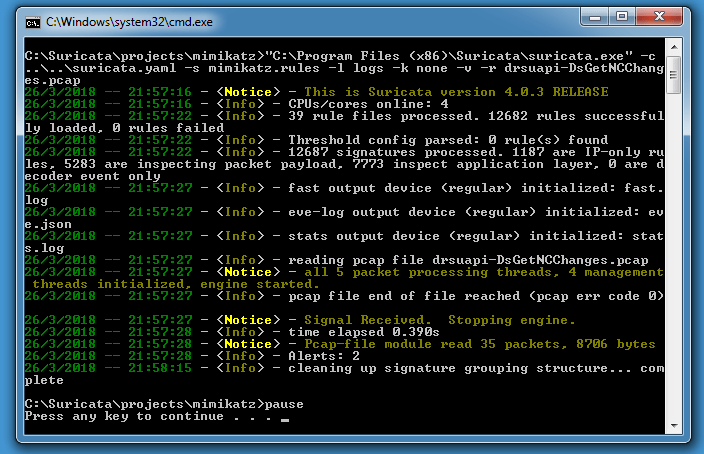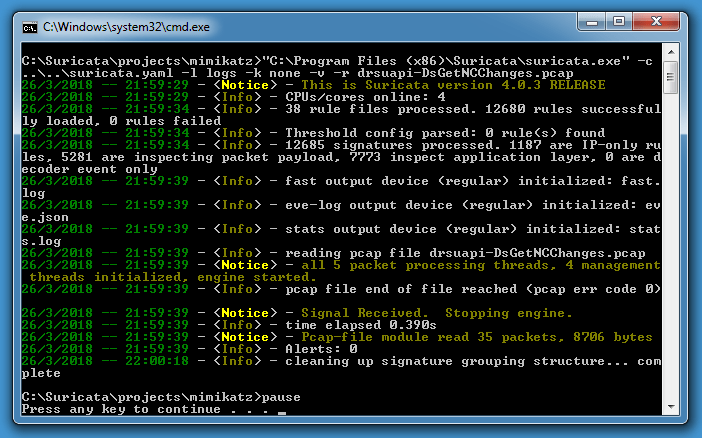 “C:\Program Files (x86)\Suricata\suricata.exe” -c ..\..\suricata.yaml -S mimikatz.rules -l logs -k none -v -r drsuapi-DsGetNCChanges.pcap