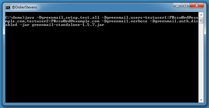 java -Dgreenmail.setup.test.all -Dgreenmail.users=testuser1:P#ssw0rd@example.com,testuser2:P#ssw0rd@example.com -Dgreenmail.verbose -Dgreenmail.auth.disabled -jar greenmail-standalone-1.5.7.jar