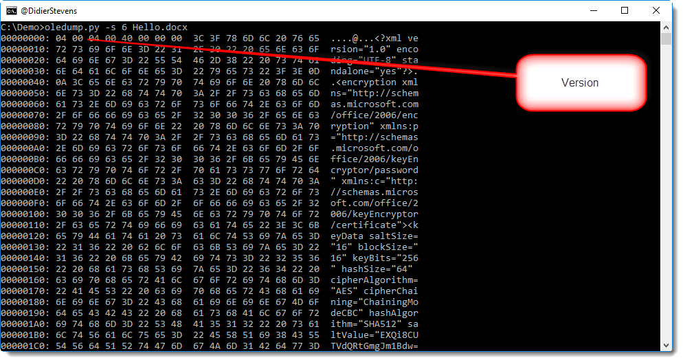 The first bytes specify the major and minor version used for the EncryptionInfo stream. This example is mostly XML: