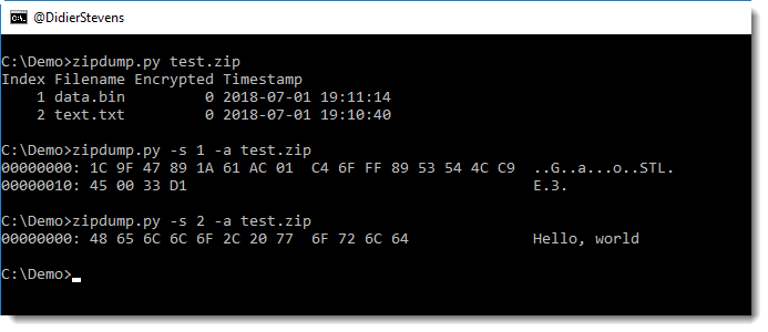 Let’s take a small ZIP files with 2 small files as example (a binary file and a text file). Here is the content displayed with zipdump: