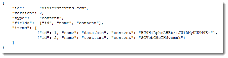 With zipdump’s option –jsonoutput, we output JSON data with the content of these 2 files encoded in BASE64: