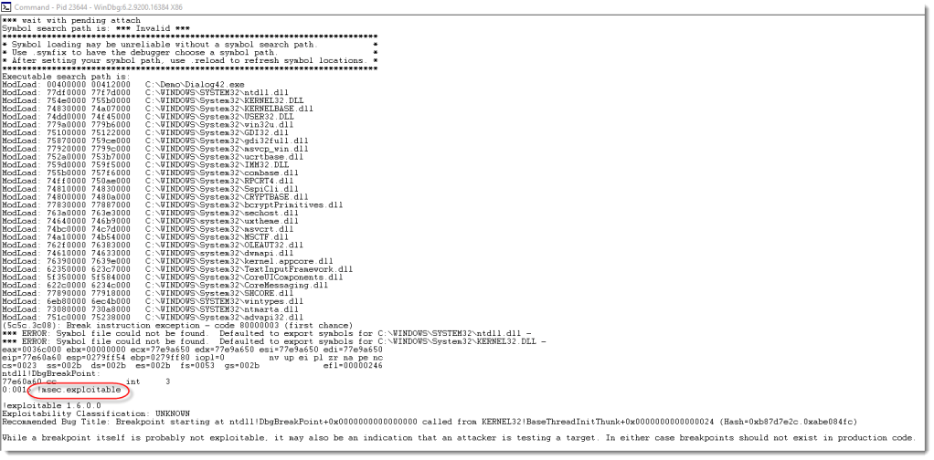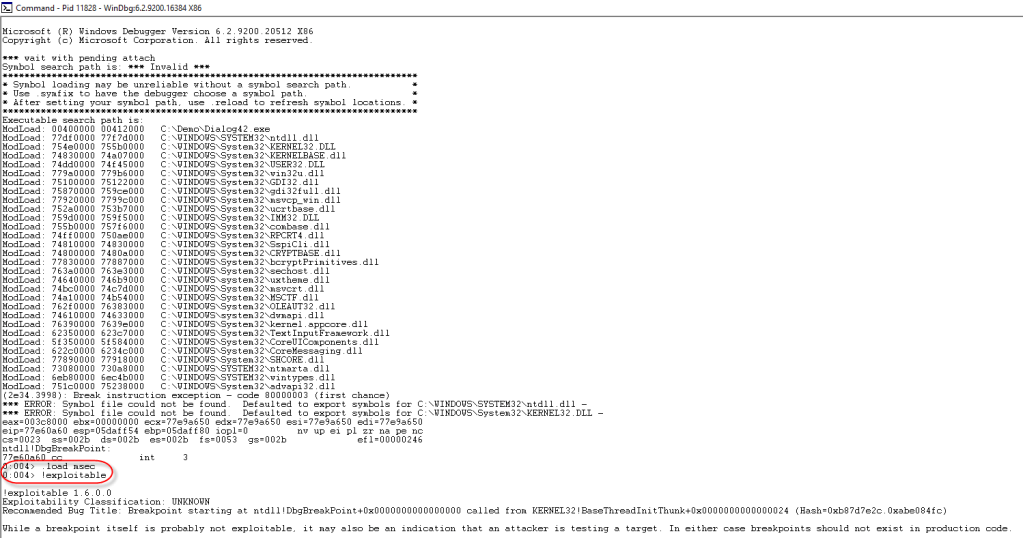 Regularly when I use Microsoft MSEC’s !exploitable WinDbg extension, it doesn’t load because the correct VC runtime is not installed (vcredist 2012) on the machine I’m debugging on.