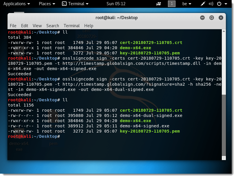 osslsigncode sign -certs cert-20180729-110705.crt -key key-20180729-110705.pem -t http://timestamp.globalsign.com/?signature=sha2 -h sha256 -nest -in demo-x64-signed.exe -out demo-x64-dual-signed.exe