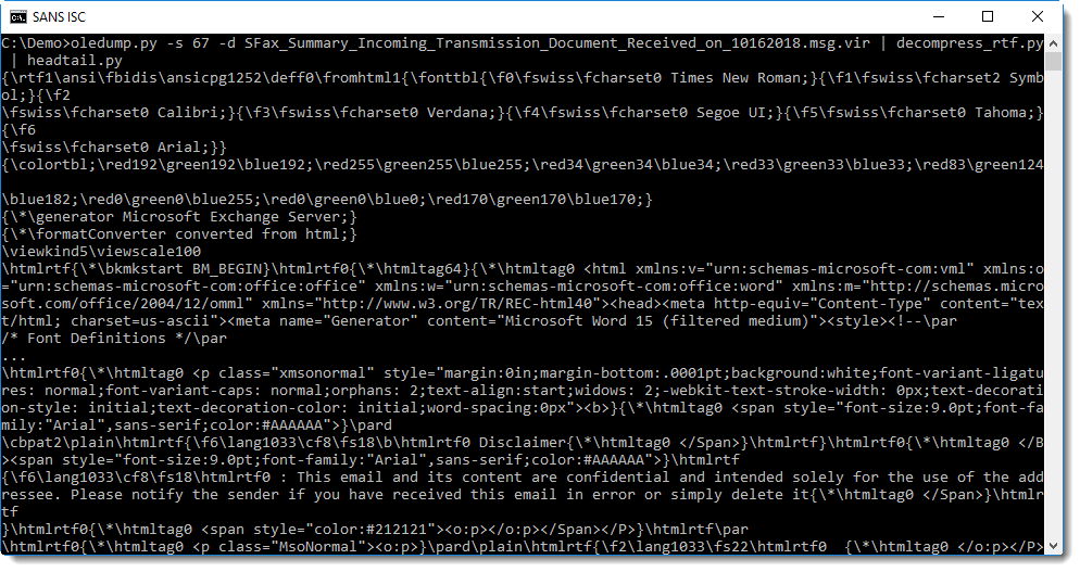 A reader over at the Internet Storm Center asked how to analyze a particular email file (.msg) with my oledump.py tool. MSG files are ole files, and can be analyzed with oledump. In this particular email, one stream contains compressed RTF.