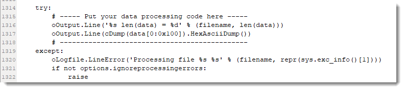 Variable data contains the complete binary content of the processed file (e.g. the compressed RTF), and a call to method compressed_rtf.decompress will decompress the data. Then I output the result with method Line of object oOutput. I use this method in stead of a print statement, because then I have more control over the output format and destination by using command-line option -o. eol=” directs the Line method not to append a new-line after outputting the decompressed RTF file.