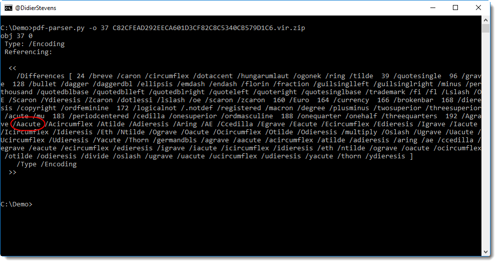 Remark that this section is the result of a search command (-s): search in pdf-parser is not case-senstive and partial (unlike PDFiD). That explains why /AA is found in object 37, while it’s actually /Aacute: