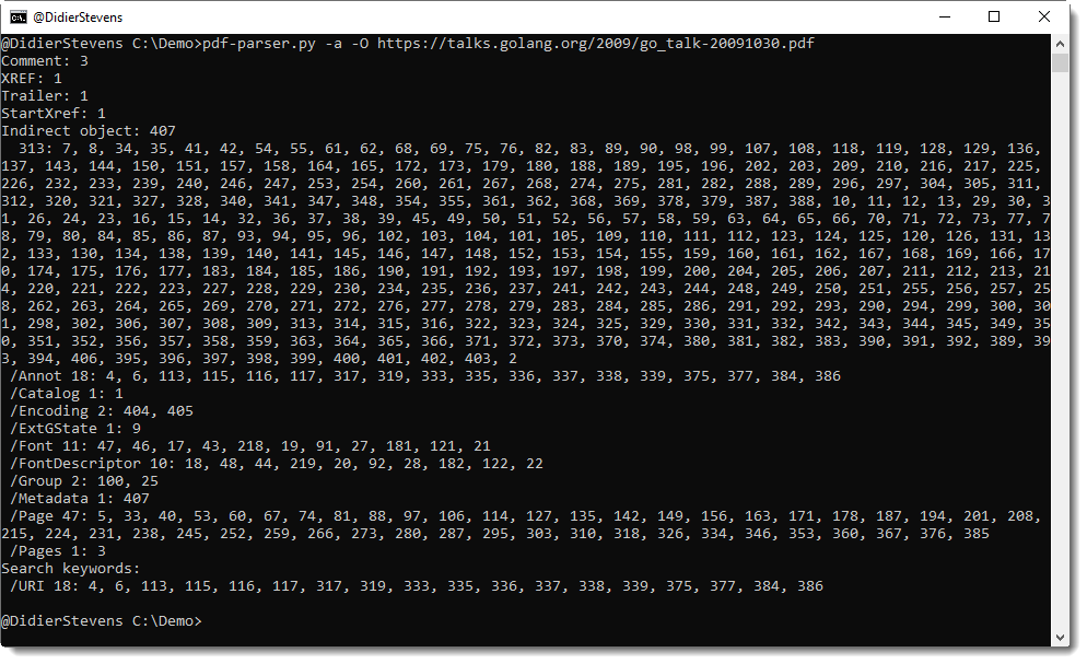 When I’m asked to perform a quick check of an online PDF document, that I expect to be benign, I will just point my PDF tools to the online document. When you provide an URL argument to pdf-parser, it will download the document and perform the analysis (without writing it to disk).