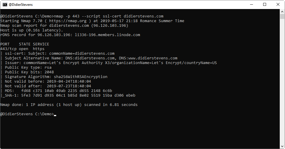 You just have to scan the site and port for which you want to check the certificate, like this: nmap -p 443 –script ssl-cert didierstevens.com