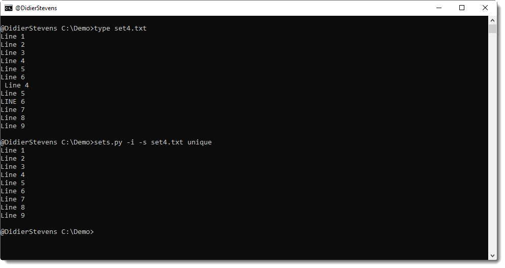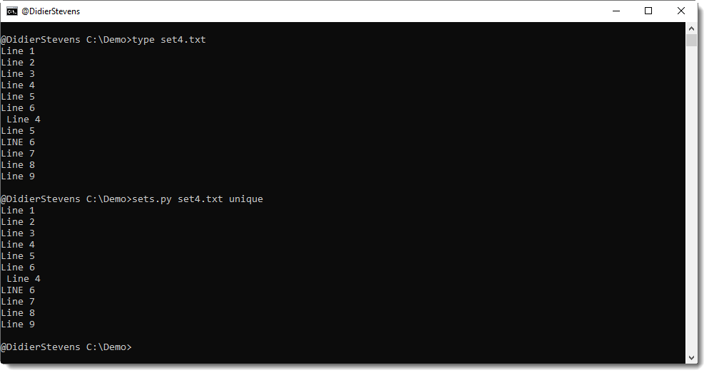 “Line 5” appears twice in set4.txt, thus one occurrence is remove by operation unique. “Line 4” and “Line 6” not, because their case is different, or because they have leading whitespace.