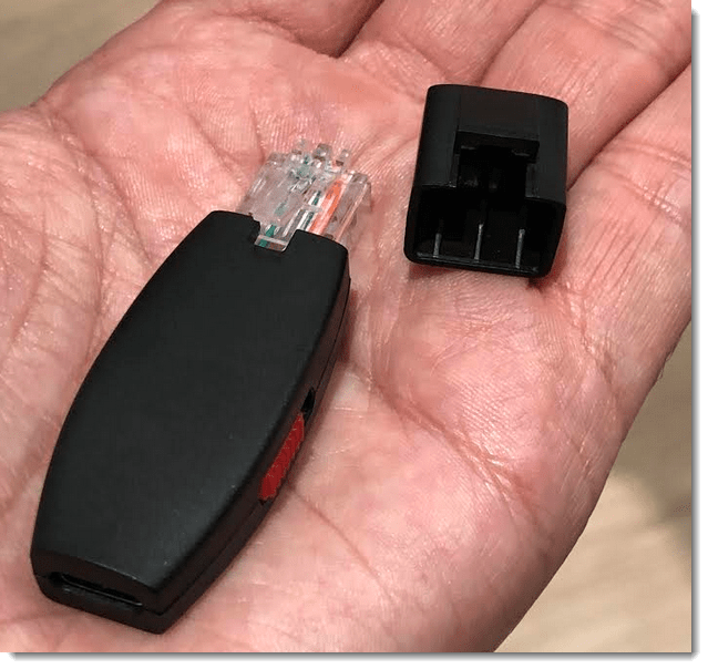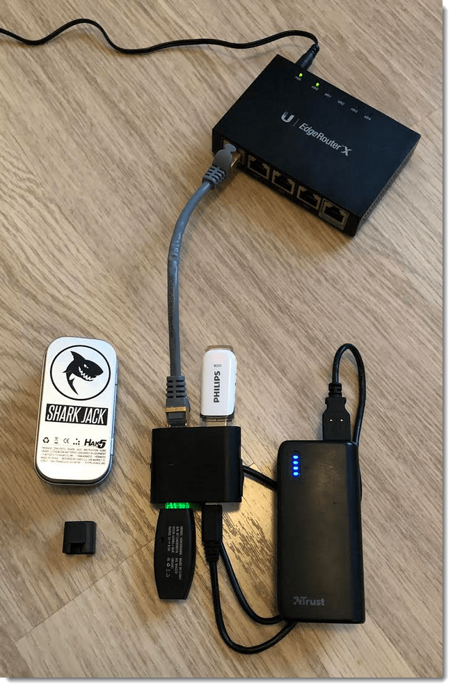 The device (small black box, almost square) between the Shark Jack (SJ) and the router is my “Packet Squirrel”: a simple network capture device.